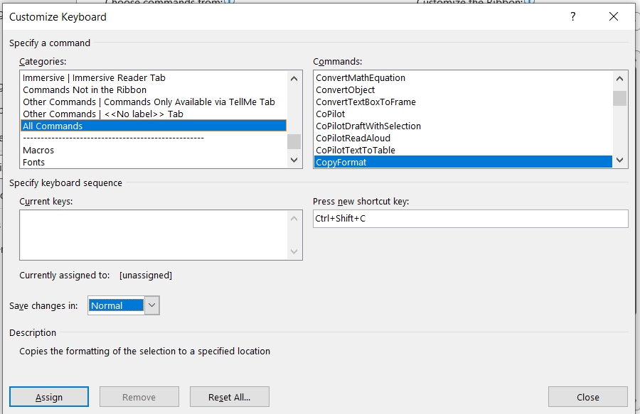 Result: Ctrl Shift V is now set as your Format Painter paste keyboard shortcut. - Click Close.